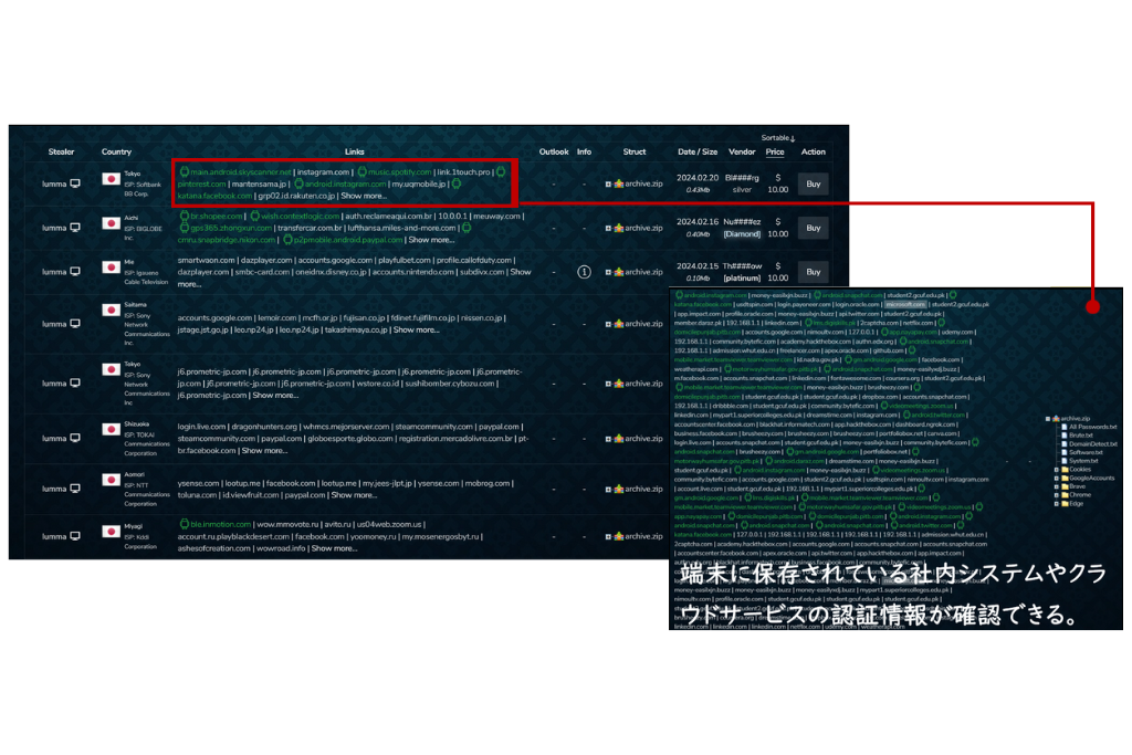 「Info Stealer」によって持ち出された情報は「ハッカーフォーラム」や「非合法な商品を扱うマーケットプレイス」に商品として出品されることがあります。下図は「LummaC2Stealer」に感染した日本の端末から盗み出した認証情報を販売しているサイトですが、このサイトだけでも18,000台以上のPCやサーバーから盗み出された認証情報が出品されています。クラウドサービスや内部システムの認証情報も含まれており、4ドル~10ドル程度で購入することができます。これらの情報が別のサイバー犯罪者の手に渡ることで、リモートアクセスの認証情報が不正利用されて内部ネットワークへ侵入されたり、クラウドサービスに対して不正にアクセスされる状況が作り出されるのです。