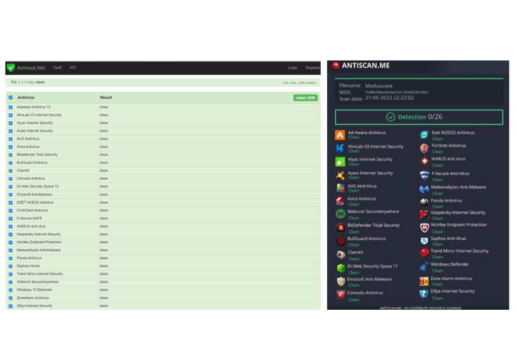 主要なアンチウイルス製品で検知できるものがないことを証明するデータ