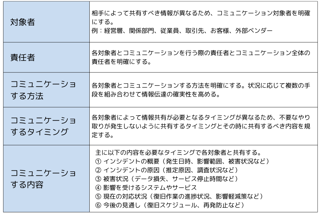 次に各対象者とのコミュニケーションに際して共有方法や共有すべき内容を決めます。平時と違いインターネット接続やメールなどのコミュニケーションツールが利用できない状態に陥っている可能性もありますし、発生した時間帯によっては関係者と連絡が取れないといったことも考えられます。コミュニケーションプランは、様々な状況を想定して準備をしておくことが重要です。