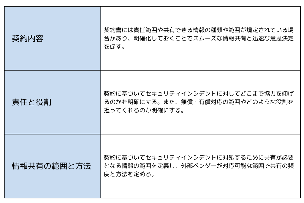 セキュリティインシデントの状況によっては社内のリソースだけでは事足りず、外部ベンダーの協力が必要になる場合があります。しかし、自組織と違い契約上の制限や責任の所在の不明確さによってスムーズに連携できない可能性があります。外部ベンダーに対しては前述のコミュニケーションプランの項目に付記する形で以下の点について整理し、あらかじめ対象となる外部ベンダーと認識合わせをしておくことが推奨されます。