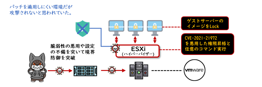 この2つの脅威と懸念は2023年に発生した「VMware ESXi」を利用しているユーザーに対して行われたランサムウェア攻撃キャンペーンの被害を拡大させた要因と指摘されています。この攻撃キャンペーンには2021年に発見された既知の脆弱性(CVE-2021-21972)が悪用されました。多くの組織でこの脆弱性が放置されていた要因には、前述のように「パッチが適用されにくい」環境であるという点に加えて、「Linuxベースで開発されているHCI(仮想技術のインフラ基盤)が攻撃される事はないだろう」というユーザー側の思い込みもあったと指摘されています。