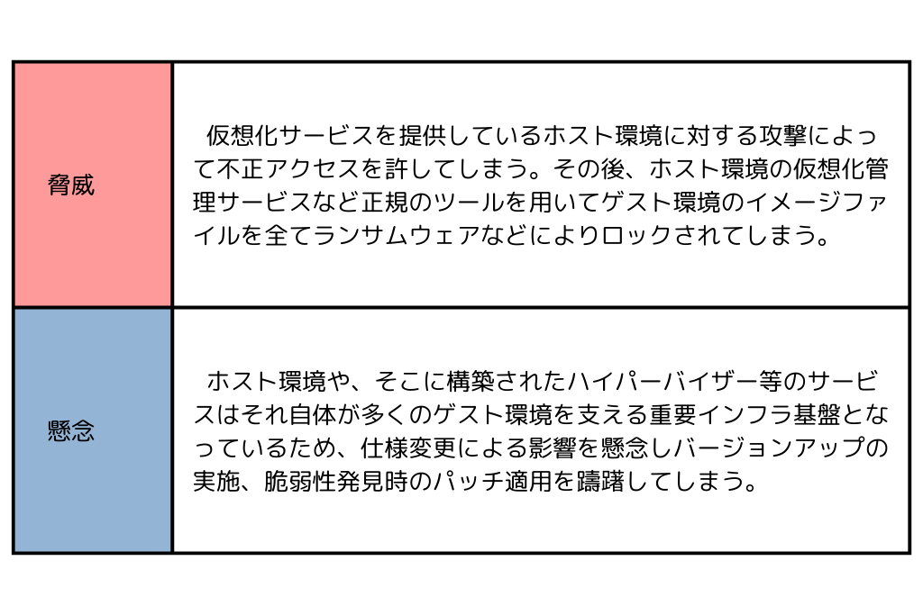 感覚的には業務システムとして動作させたり、クライアントPCとして利用する事が多いゲスト環境こそサイバー攻撃対策が重要であると考える方は多いと思います。しかし近年のサイバー攻撃を観察する限りではホスト環境も、ゲスト環境と同様にサイバー攻撃を受けるリスクがある保護対象として捉える必要があります。仮想化サービスの移行においては、これらリスクを緩和するセキュリティ対策を技術面、運用面の両方で実行可能な仕様であるかも是非一緒にご検討下さい。