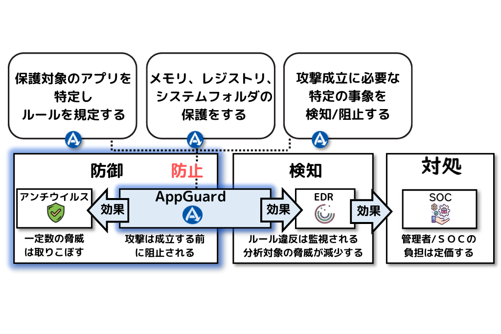 「AppGuard」はCSFの機能の「防御と検知」を担うエンドポイントセキュリティ製品です。攻撃成立に不可欠な「特定の事象」を命令レベルで検知し、ルールに基づいて適切な制御をすることで、脅威の発症を「防止」することを目的としています。強固な防御策が実施された組織は、フレームワークにおける後工程の負荷を大幅に軽減することが出来きます。