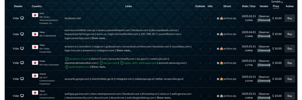 図 ブラックマーケットで販売されるStealer Log(InfoStealerが盗んだデータ)