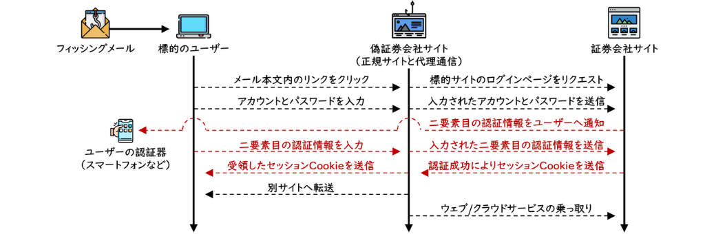 これらの手法は、多要素認証(MFA)を突破するために設計されたフィッシング攻撃です。攻撃者は、被害者と正規サイトの間に割り込む形で通信を中継します。例えば、被害者がフィッシングサイト(偽の証券会社ログインページ)に認証情報を入力すると、攻撃者はリアルタイムでその情報を正規サイト(本物の証券会社ログインんページ)で使用します。正規サイトがMFAコード(ワンタイムパスワードなど)を要求すると、フィッシングサイトがその要求を被害者に中継します。被害者がMFAコードをフィッシングサイトに入力すると、攻撃者はそれを利用して正規サイトへのログインを完了させることで不正アクセスを成立させます。