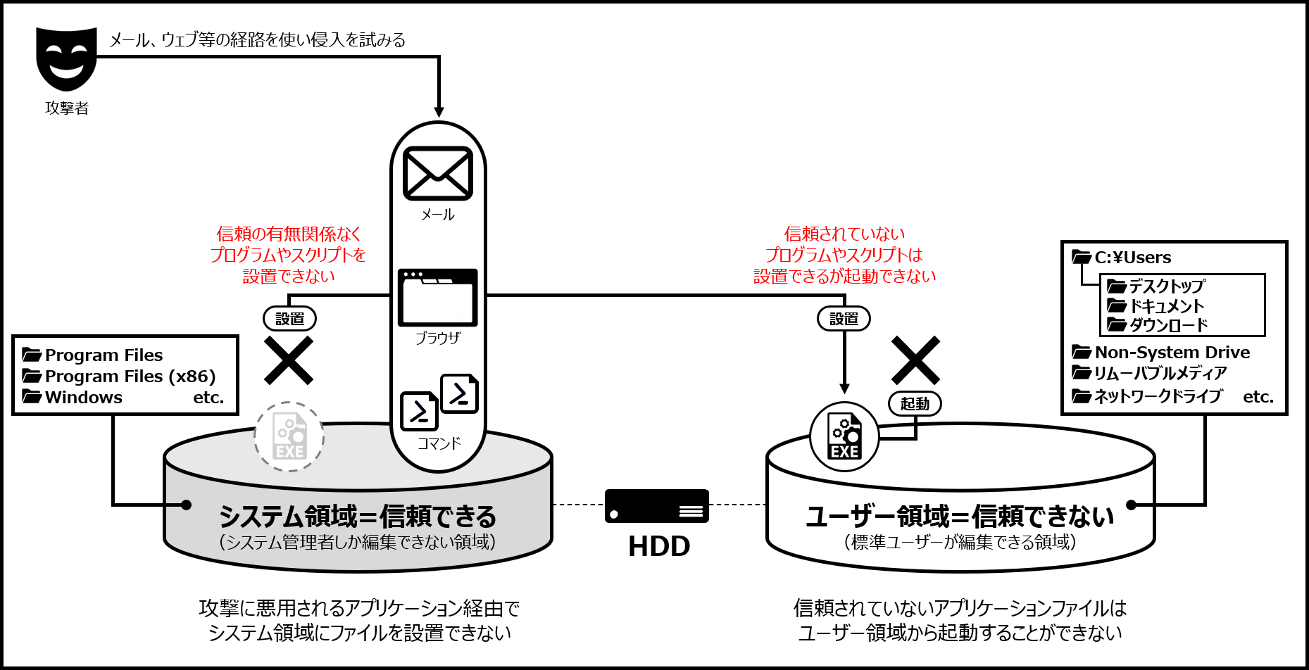 そして、もう一方の領域としてユーザープロファイル配下のフォルダ群やDドライブ、リムーバブルメディア等のサインインユーザーが自由に編集できる領域を「ユーザー領域」として定義します。ユーザー領域では自由にファイルを設置することができますが、AppGuardが信頼した発行元のデジタル署名を保持したアプリケーション以外は個別の例外設定を除いて当該領域から起動することはできなくなります。