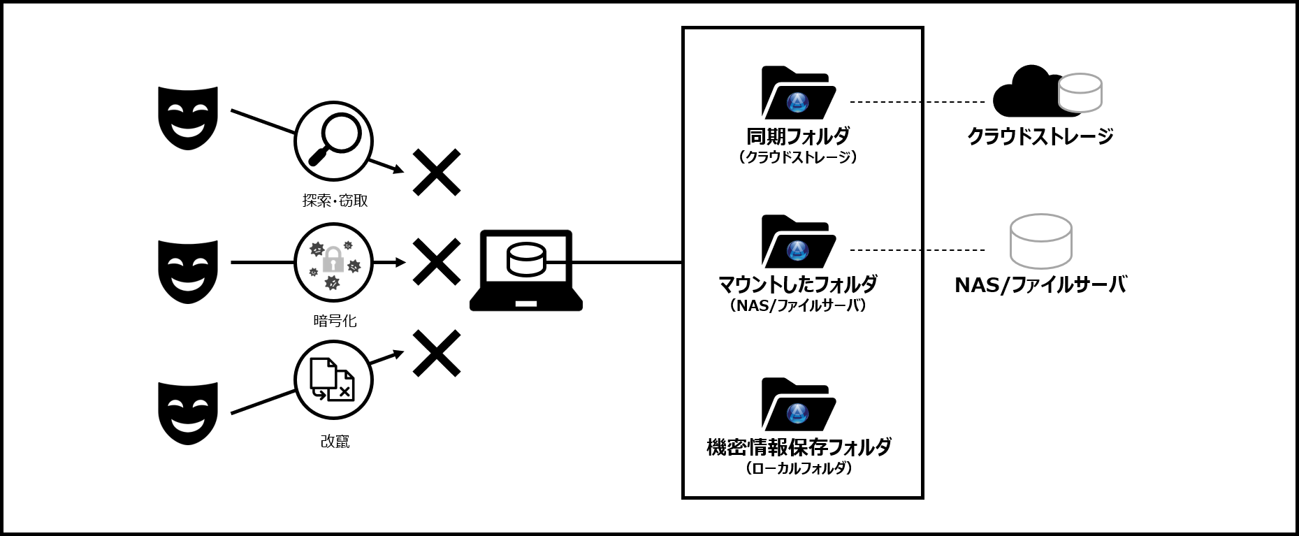 まず、筆者としては自身の端末を通じて別のシステムに格納しているファイルに外部からの攻撃で影響が出ないようにクラウドストレージやマウントしているフォルダをPrivate Folderとして保護することを推奨しています。その上でどうしてもローカルディスク内に保存せざるを得ない重要情報を格納するフォルダに対してPrivate Folderとして指定します。この設定により外部からの攻撃に対して重要なファイルが侵害される事はなくなります。