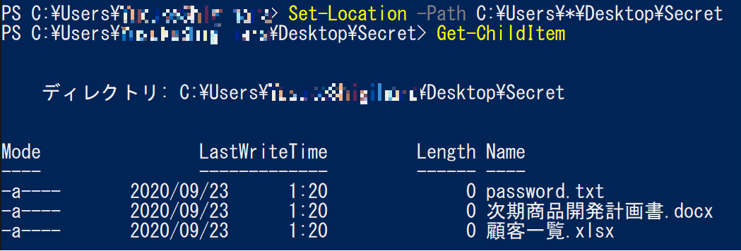 下図のとおり、PowerShellのコマンドを通して指定したフォルダの中に格納されているファイル一覧を取得することも可能です。その手法を用いてデスクトップ上の「Secret」というフォルダの情報取得を試みると、下図の通り「Name」の列に重要なファイルと思わしきものが見えてしまっています。PowerShellを利用すれば端末内を探索して価値の高い情報だと思わしきものを別の場所に複製して外部のサーバーへアップロードし、端末内における活動の痕跡を削除するといったことも当然可能です。