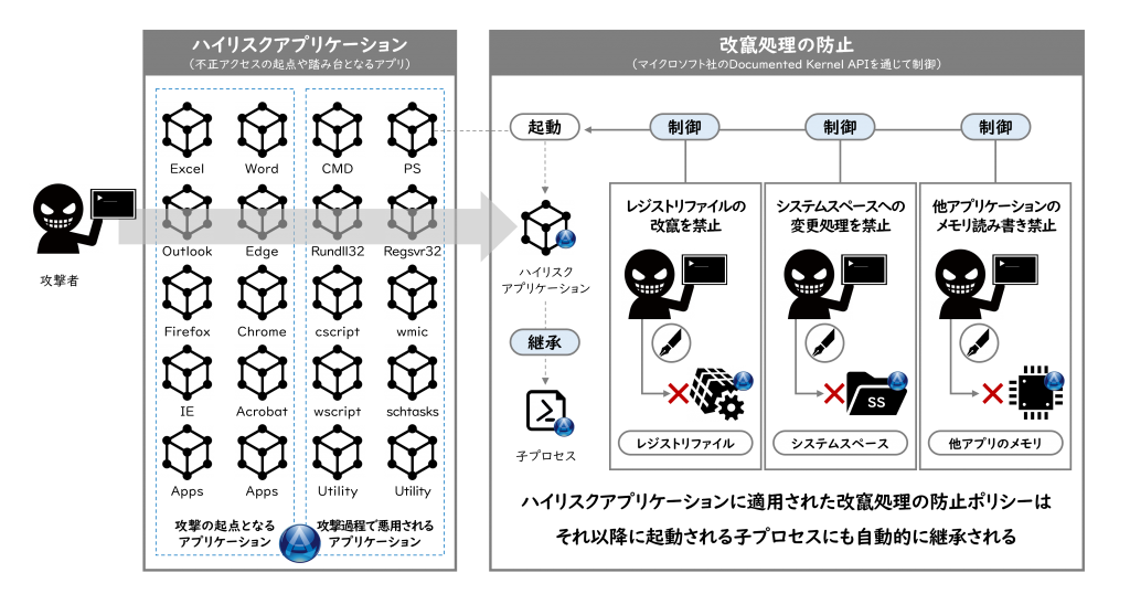 前述のとおり、AppGuardの改ざん処理防止機能はアプリケーション自体の善悪を判断しているわけではなく、実行主体問わずハイリスクアプリケーションを呼び出して3つの制御ポリシーに抵触する処理が行われると制御する仕組みとなっています。