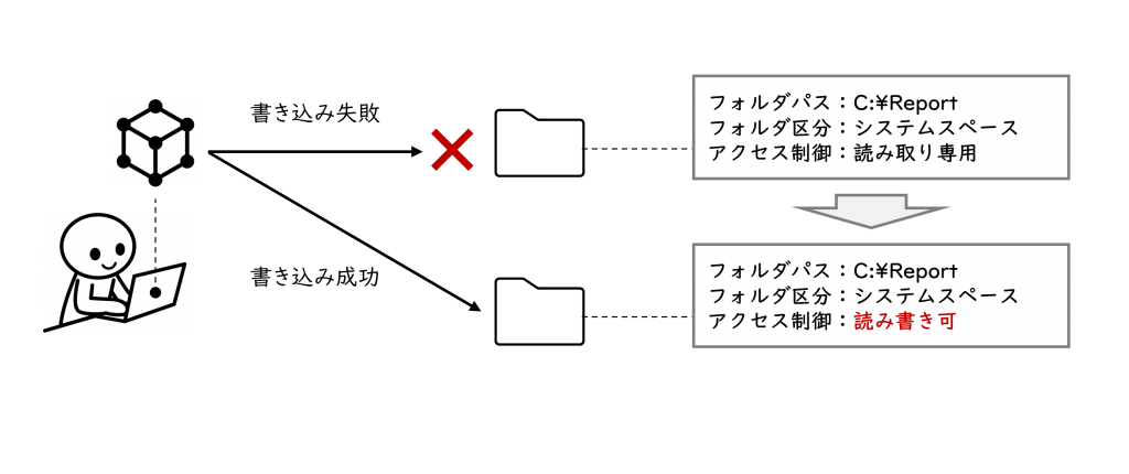 例えば、MS Excelのアドインを利用してCドライブの直下にあるフォルダ(例:C:\Report)へレポートを出力する操作が行われた場合、このレポート出力処理(C:\Reportへの書き込み)はAppGuardによって制御されてしまいます。これはMS Excelがハイリスクアプリケーションであるため、それを通じてシステムスペースに区分されるCドライブ直下のフォルダに対して変更処理をかけることができないためです。