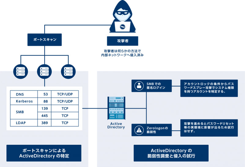 本ブログでは組織の内部ネットワークに攻撃者が何らかの方法で侵入した状態を想定し、その状態から内部ネットワークで稼働するActive Directoryを探し出し、管理者権限を奪取するまでの流れを再現することで対策のポイントを導き出していきます。