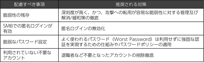 上記で紹介したActive Directoryへのペネトレーションテストの結果からActive Directoryを運用する上で配慮すべき事項と推奨される対策を以下に示します。
