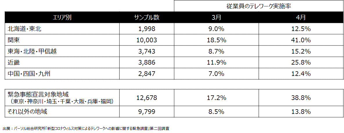 COVID-19感染拡大対策における新しいワークスタイルとしてテレワークの導入が推奨され、特に緊急事態宣言対象地域では実施率が高くなっています。しかし、一方ではそれ以外の地域においては想定をはるかに下回る実施率であり、業態的にテレワークが難しい又は時間的に環境を準備できなかった等の要因が考えられます。