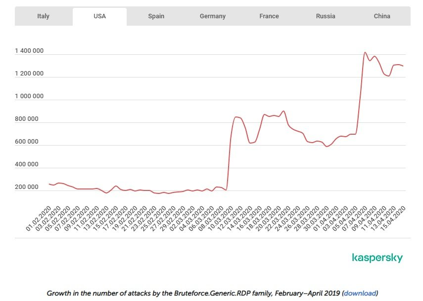 米国においてRDPを狙った総当たり攻撃の傾向(出典:Kaspersky)