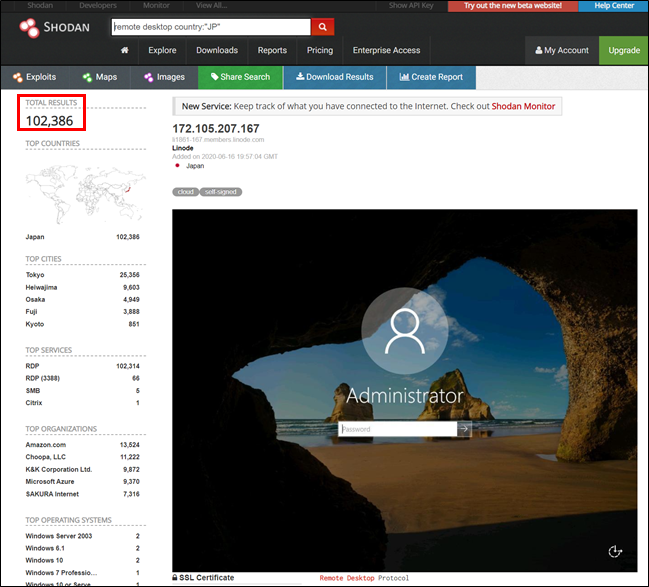 さらにインターネットに接続されている機器等を検出する「SHODAN」というサイトで日本国内においてRDPを外部に公開しているデバイスの数を調べると10万台(2020年6月17日調査)を超えていました。