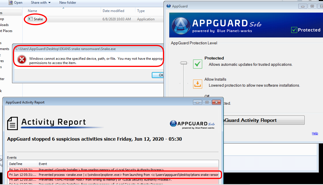 検証の結果、EKANS/SNAKEマルウェアが従来のマルウェア生成・感染プロセスで利用されているユーザープロファイル配下の領域で展開された場合、AppGuardのスペースルールによる起動制御で確実にブロックできることを確認しました。なお、AppGuardの防御メカニズムは弊社ブログを参照してください。