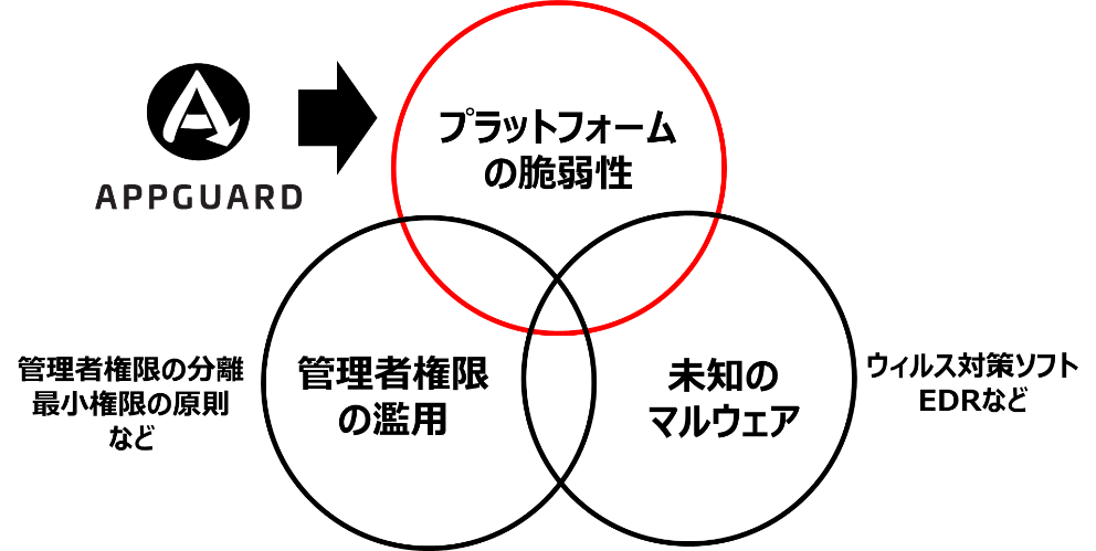AppGuardは脅威を見つけることを目的とした対策ツールが苦手とするOSやアプリケーションの脆弱性を利用してプラットフォームの一貫性を毀損しようとする攻撃に対して非常に有効です。なぜならAppGuardは脅威に対する防御機構ではなく、攻撃を阻止することを目的として作られているからです。