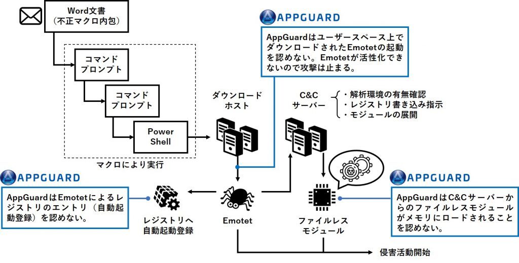 また、当社の「AppGuard」では「Emotet」の脅威を以下のとおり阻止することができます。