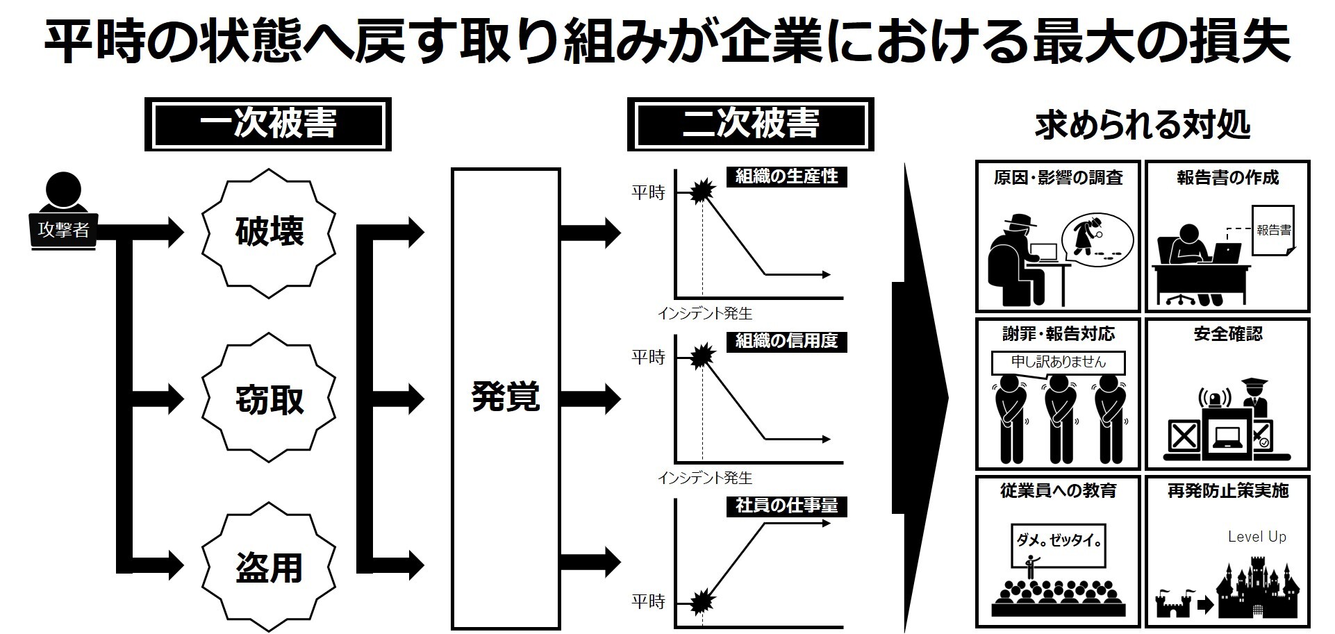 このように「Emotet」固有の問題もありますが、マルウェアに感染したという事実が明るみになった場合、組織運営を正常な状態に戻すために多大な損害を被ることになります。サイバー攻撃被害の本当の怖さは、マルウェア等による直接的な被害よりも結果として発生する様々な復旧活動に係る組織の経済的損害です。だからこそ、セキュリティ対策を検討する上では脅威に晒された時に生じる損害を定量的に試算した上でリスクの重み付けを行い、投資の優先度や予算の配分を検討していくことが重要なのです。