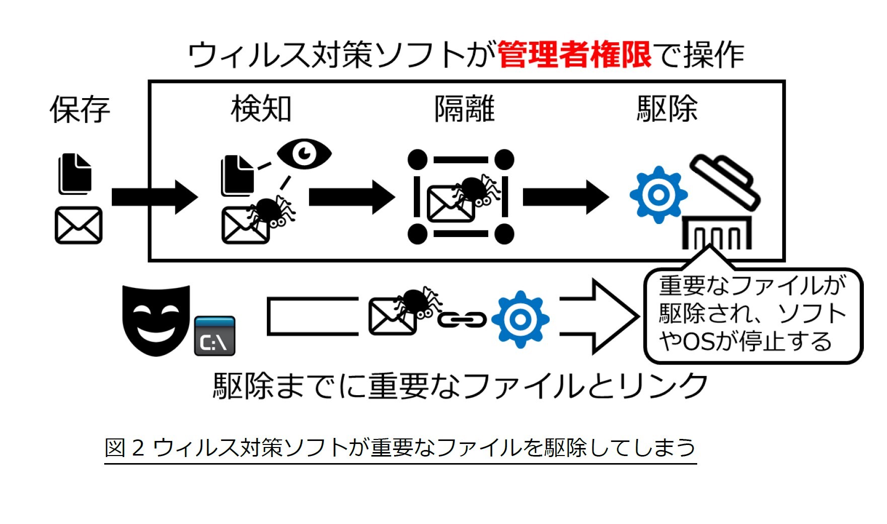 公表された手法とは、ウィルス対策ソフトが管理者権限をもってマルウェアを検知してから隔離、駆除する一連の操作にタイムラグがあり、その瞬間にWindowsシステムで利用されるディレクトリジャンクションやLinux、MacOSでよく利用されるシンボリックリンクというフォルダまたはファイルを連携する機能を偽装して、オペレーシングシステムやウィルス対策ソフトの重要なファイルを削除したり置き換えたりすることが出来るというものです。ウィルス対策ソフトがマルウェアを駆除しているつもりが自己破壊を起こさせるということも可能なのです(図2)。