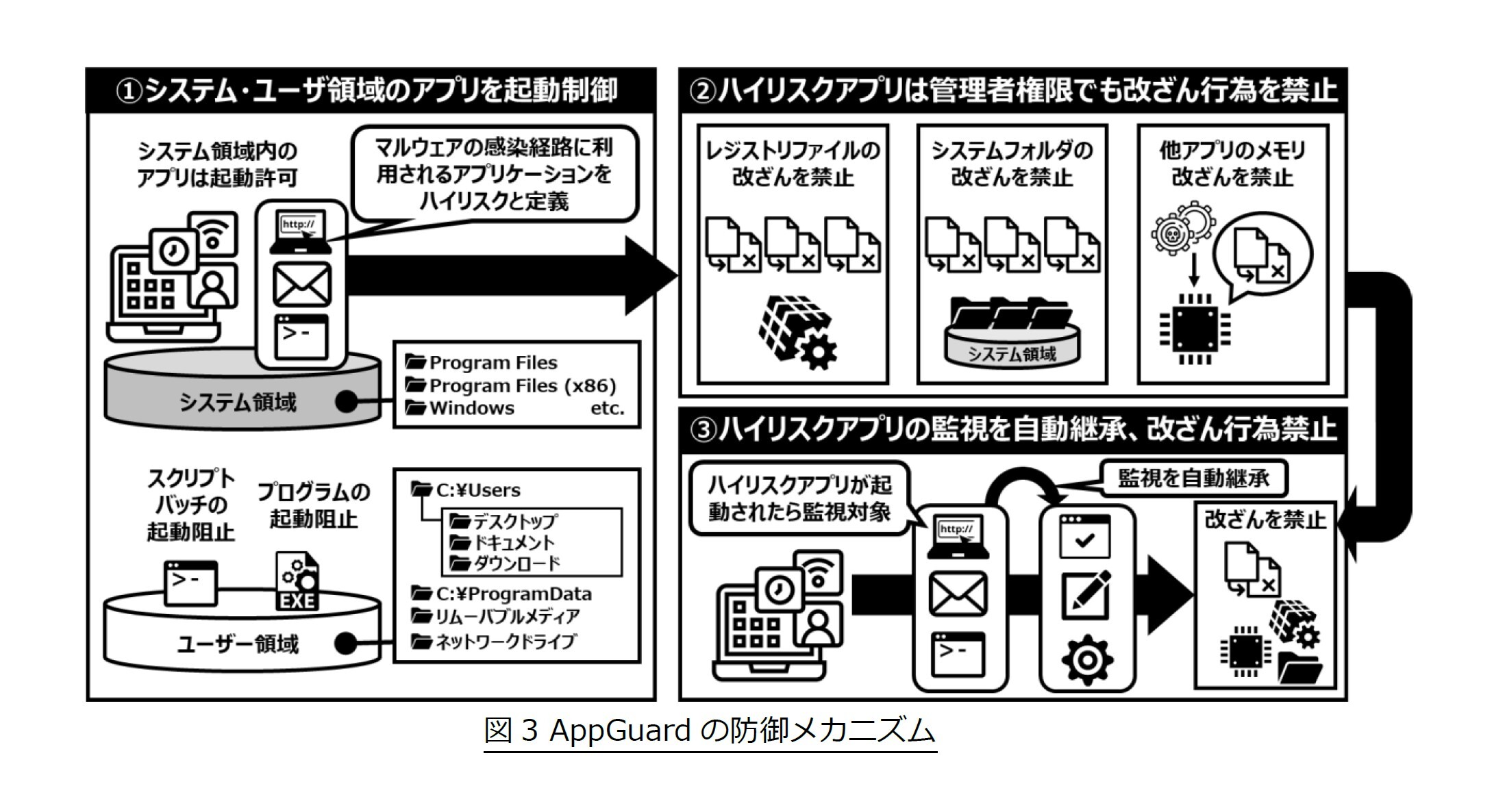 AppGuardは大きく3つのメカニズムで防御しています(図3)。