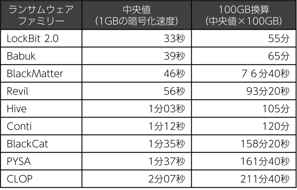 攻撃者がランサムウェアによる暗号化を身代金要求の手段として利用する場合、システム管理者に検知されないように暗号化処理を完遂させる必要があるため、暗号化処理速度の向上は重要課題の1つとなります。