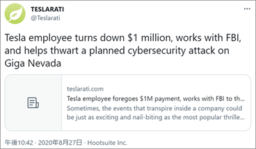 図 従業員を買収しようと接触があったことをTwitterで公開したテスラ社
