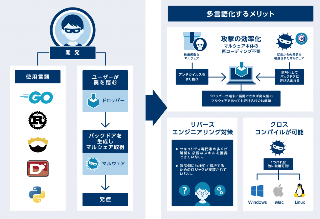 マルウェアを構成するプログラム言語としてはC言語ファミリーが一般的ですが、最近ではGo、Rust、Nim、D、Pythonといった異なるプログラム言語で書かれたマルウェアが台頭してきています。これらのプログラム言語で書かれたマルウェアを難読化処理することで、従来のマルウェアと比べてもリバースエンジニwアリング(マルウェアの構造分析を行い検出するための情報を得ること)を困難にすることができます。また、その性質からクロスコンパイル(単一のソースコードを元にして異なるOS環境向けに実行可能なものとして生成すること)できるものも多く、Windows以外のOSに対しても流用できるため、攻撃者にとっては検出されにくく使いやすいというメリットがあります。