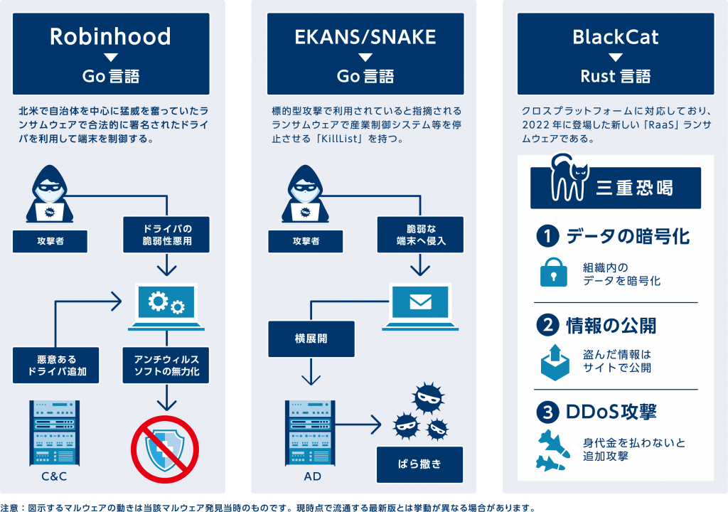 かつて国内大手製造業を襲ったランサムウェアも従来とは異なるプログラム言語で構成されていたことがわかっており、セキュリティ対策に注力していた組織においても、その検出が非常に困難であったことが伺い知れます。