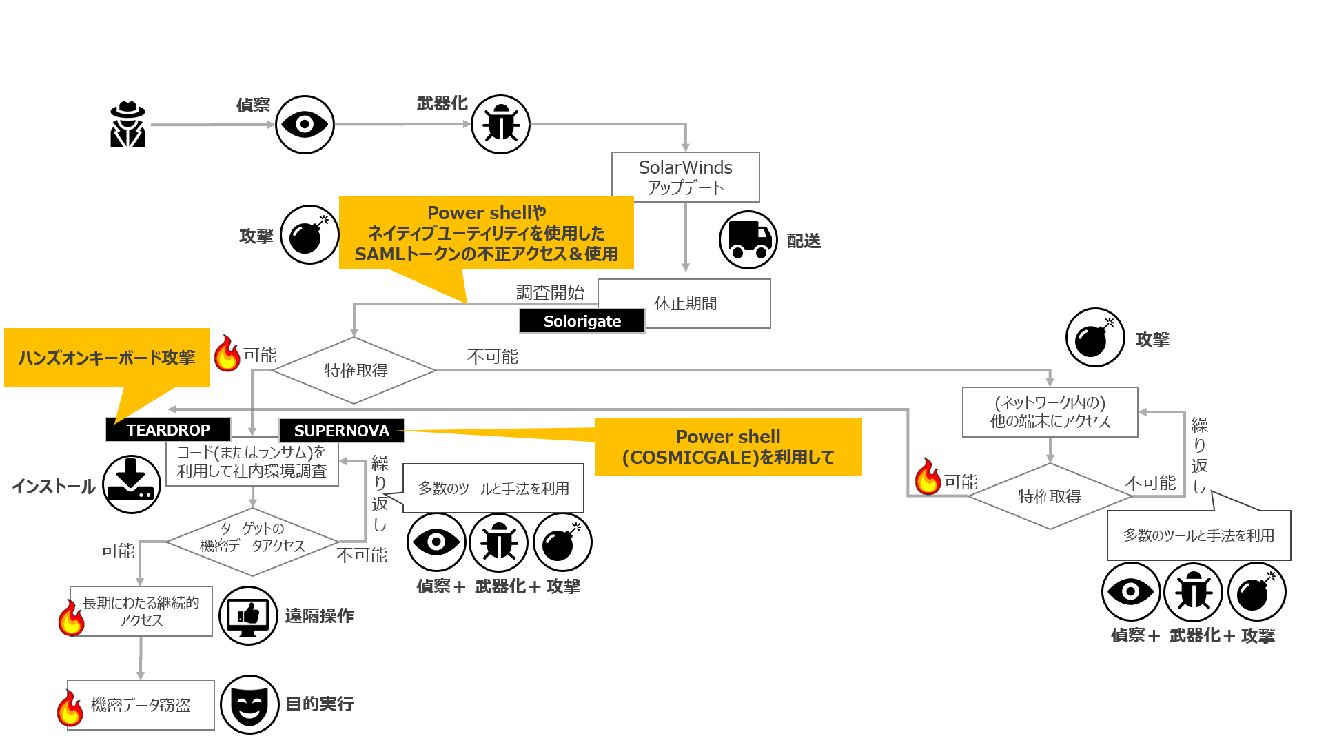 図5 SolarWinds製品に対するサプライチェーン攻撃の被害フロー(弊社類推)(クリックで図の表示)