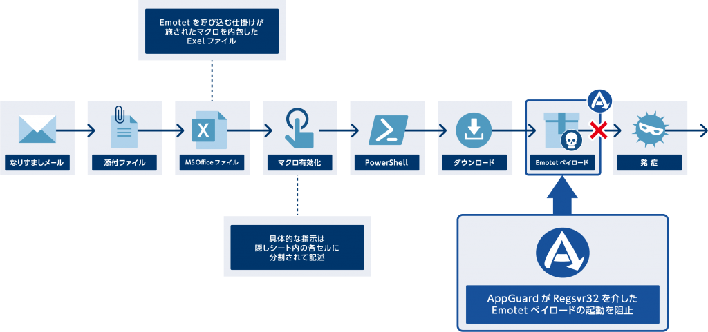 世間では「Emotet」の脅威が注視されていますが、実態としてはそれ以外の脅威も数多くユーザーに着弾していることがわかりました。しかし、最終的に発症させたい脅威は異なっていても、それらを発症させるための攻撃手法はいくつかのパターンに分類できます。AppGuardによって阻止された攻撃の中から具体的な攻撃手順とAppGuardが阻止するポイントをいくつか図示します。