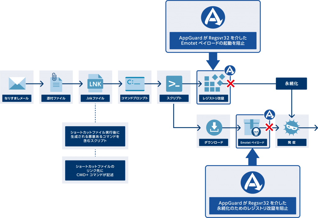 この攻撃手法は「Emotet」が新たに採用した手口です。MS Officeファイル等のアイコンに偽装したショートカットファイル(.lnk)に設定された実行パスにはコマンドプロンプトを呼び出して特定のコマンドを実行するための構文が埋め込まれています。誤ってこのショートカットファイルを起動すると永続化を目的としたレジストリファイルの改ざんと「Emotet」のペイロードがダウンロードされます。AppGuardはコマンドプロンプトをハイリスクアプリケーション(攻撃者が悪用する可能性があるアプリケーション)として扱うため、レジストリの変更処理を認めず永続化を阻止します。また、ダウンロードされた「Emotet」のペイロードは起動が制御されるため発症させることなく攻撃を阻止します。