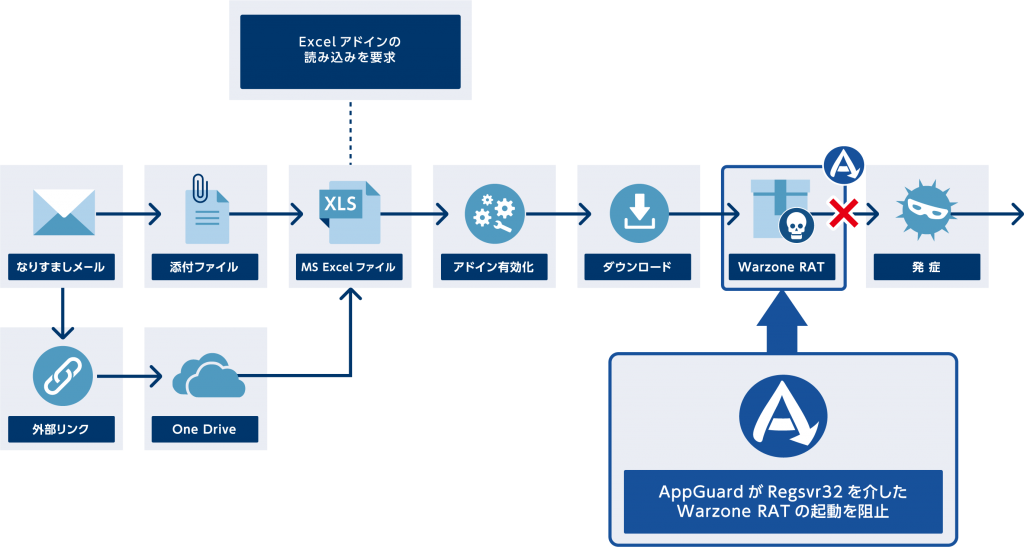この攻撃手法は「Emotet」が用いるMS Officeのマクロを悪用したものと似ています。「WarZoneRAT」はメールの添付ファイルにExcelアドイン(.xlam)を格納して送りつけます。ファイルを起動するとExcelアドインの読み込み要求画面が表示され、許可することで「WarZoneRAT」のダウンロードを開始します。AppGuardはExcelアドインを通じて呼び込まれる「WarZoneRAT」のペイロードの起動を制御するため発症させることなく攻撃を阻止します。