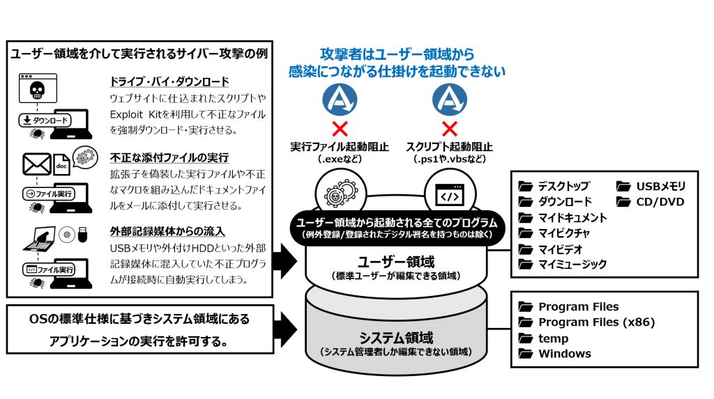 AppGuardが提供する基本機能には「ユーザー領域からのアプリケーション起動制御」と「改竄(かいざん)処理の防止」機能があります。前者はユーザー領域(標準ユーザーが編集できる領域)から起動しようとする信頼されていない実行ファイルやスクリプトの起動を阻止します。