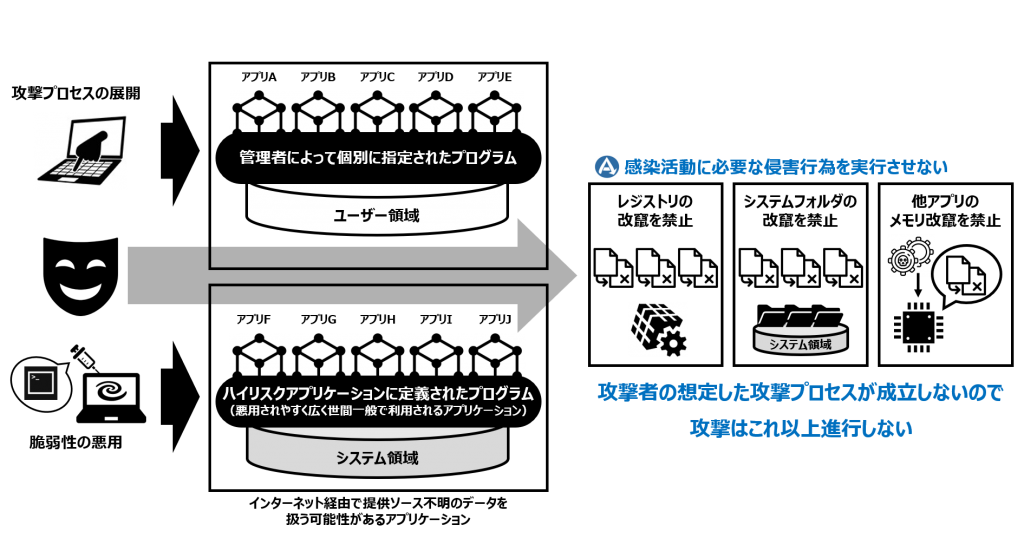 後者は、管理者が個別に指定したアプリケーションと、攻撃者に悪用されやすく広く世間一般で利用されているアプリケーションである「ハイリスクアプリケーション」に対し、これらのアプリケーションを通じて「レジストリの改竄」「システム領域の改竄」「他アプリのメモリに対する読み取り/書き込み」をポリシーとして禁止します。