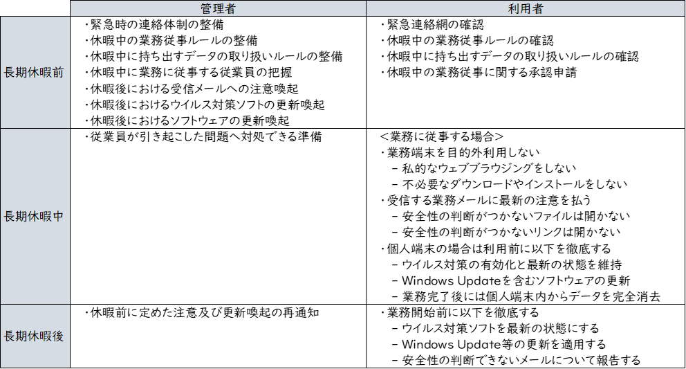 情報システムの担当者としては、休暇中に業務を行う従業員がいるのか、という点の把握は最低でも必要です。そして、その従業員が業務を行う場所、使う端末、扱う情報なども、きちんと把握しておくようにしましょう。また、大切なのは、このように定めたルールを守らない従業員がいる場合も想定しておくことです。ルールを必ず守ってもらえる、という前提だけで考えるのではなく、そのようなことも想定してルールや体制を決めておくことで、もしものときにも慌てずに対処できます。また、定めたルールを周知し、守ってもらうことも大切ですが、本当に休暇中にやらなければならない業務なのかを改めて見直すことも大切です。そもそも休暇中に業務を行わなければ、休暇中の業務の仕方などに気をつける必要がなく、それらを原因としたトラブルも発生することはありません。
