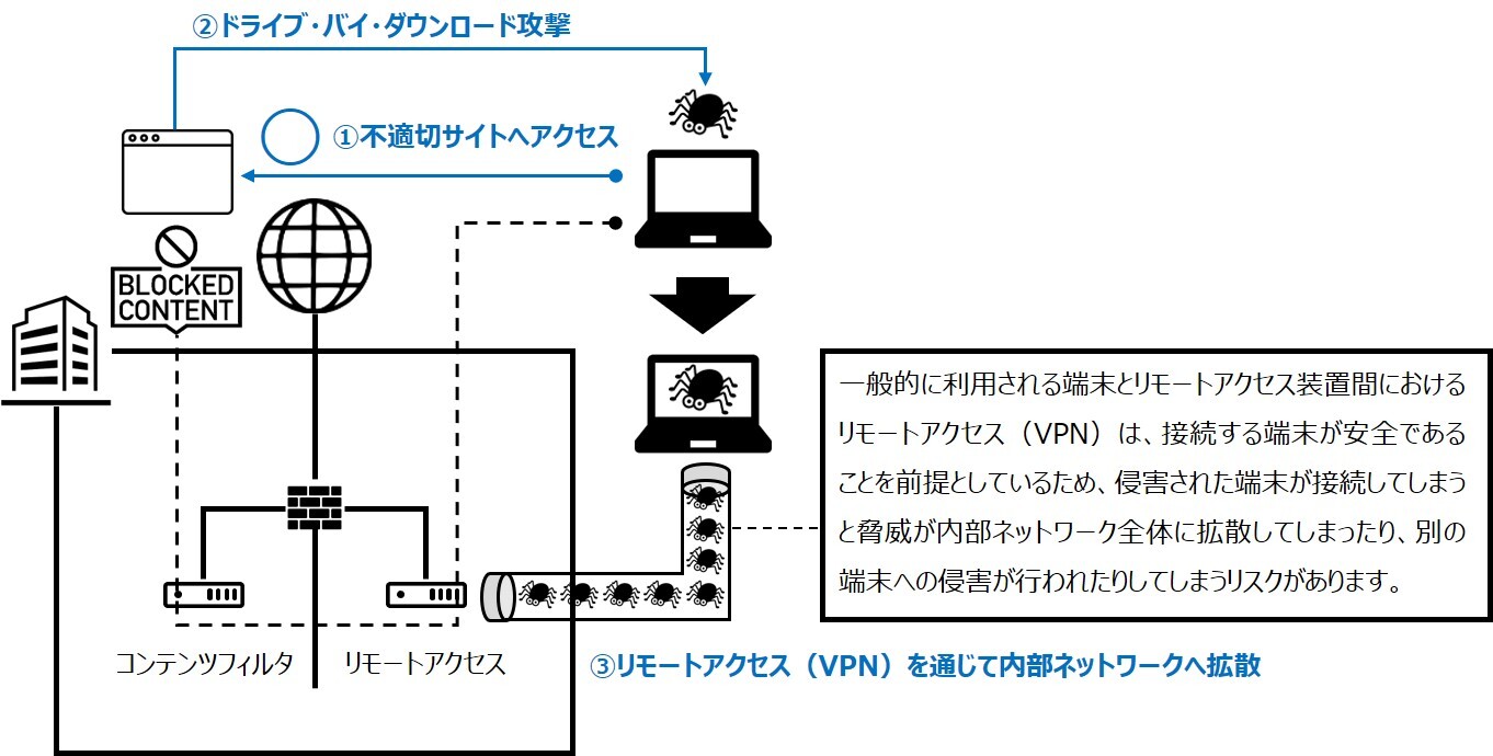 A社はウェブサイトの閲覧には社内に設置しているコンテンツフィルタを通してアクセスさせていたので不適切なウェブサイトには閲覧制限がかかっている状態でした。また、業務端末を外部に持ち出す場合、必ずリモートアクセスツールを通じて社内に接続してからインターネットを利用することになっていました。しかし、田中さんはリモートアクセスツールで社内へ接続せずに直接インターネットへ接続していたことからコンテンツフィルタを経由していませんでした。A社のシステム担当者によれば、田中さんは社内にリモートアクセスしない状態であれば、普段は制限されている不適切なウェブサイトを閲覧できることを知っていたそうです。「少しぐらいなら大丈夫だろう」という気の緩みがインシデントを発生させる引き金を引いてしまったのです。