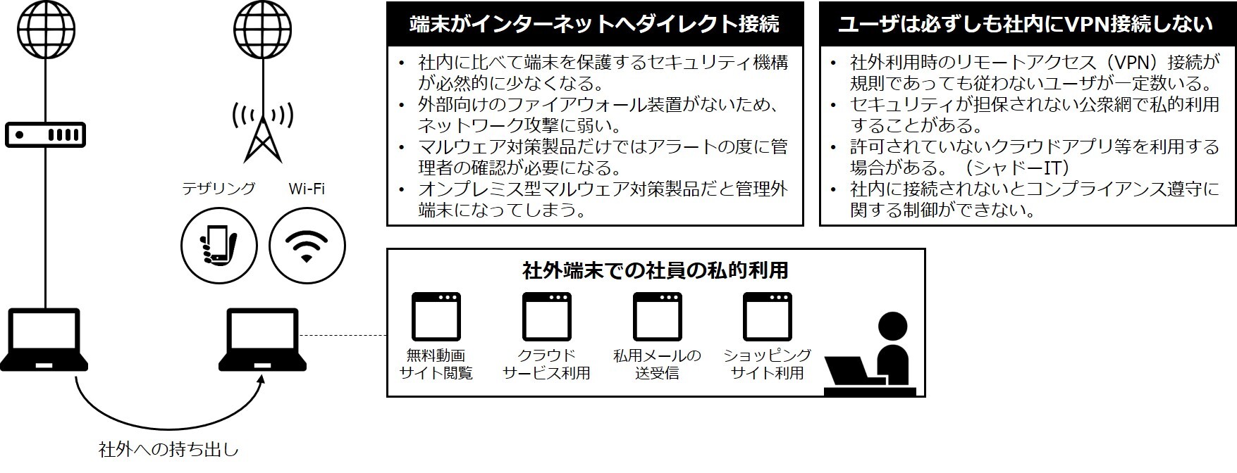 働き方が多様化して社外で業務端末をインターネットに接続する機会が増えています。しかし、システム管理者として認識しなければならないのは、社内と社外ではセキュリティレベルに差異があるということです。例えば、「ファイアウォール装置」「UTM」と称されるインターネットと社内ネットワークの境界線に配置されるセキュリティ対策装置は社外からインターネット接続する際には経由しないため、その恩恵を受けるためには前述のリモートアクセス等により社内経由のインターネット接続を確立しなければなりません。公衆無線LANやホテルのインターネット接続サービス等は、業務端末が直接インターネットに接続されますので端末内のセキュリティ機構だけで安全措置を講じることになりますので必然的にセキュリティレベルは低下します。