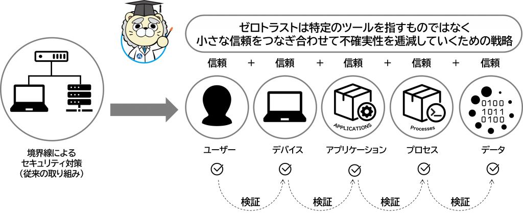 ゼロトラストとは、「信頼」したものは「検査」をしないという前提から、「信頼」したものでも必ず「検証」をするという前提に立つことを意味し、小さな信頼をつなぎ合わせて不確実性を低減していくための戦略を示します。