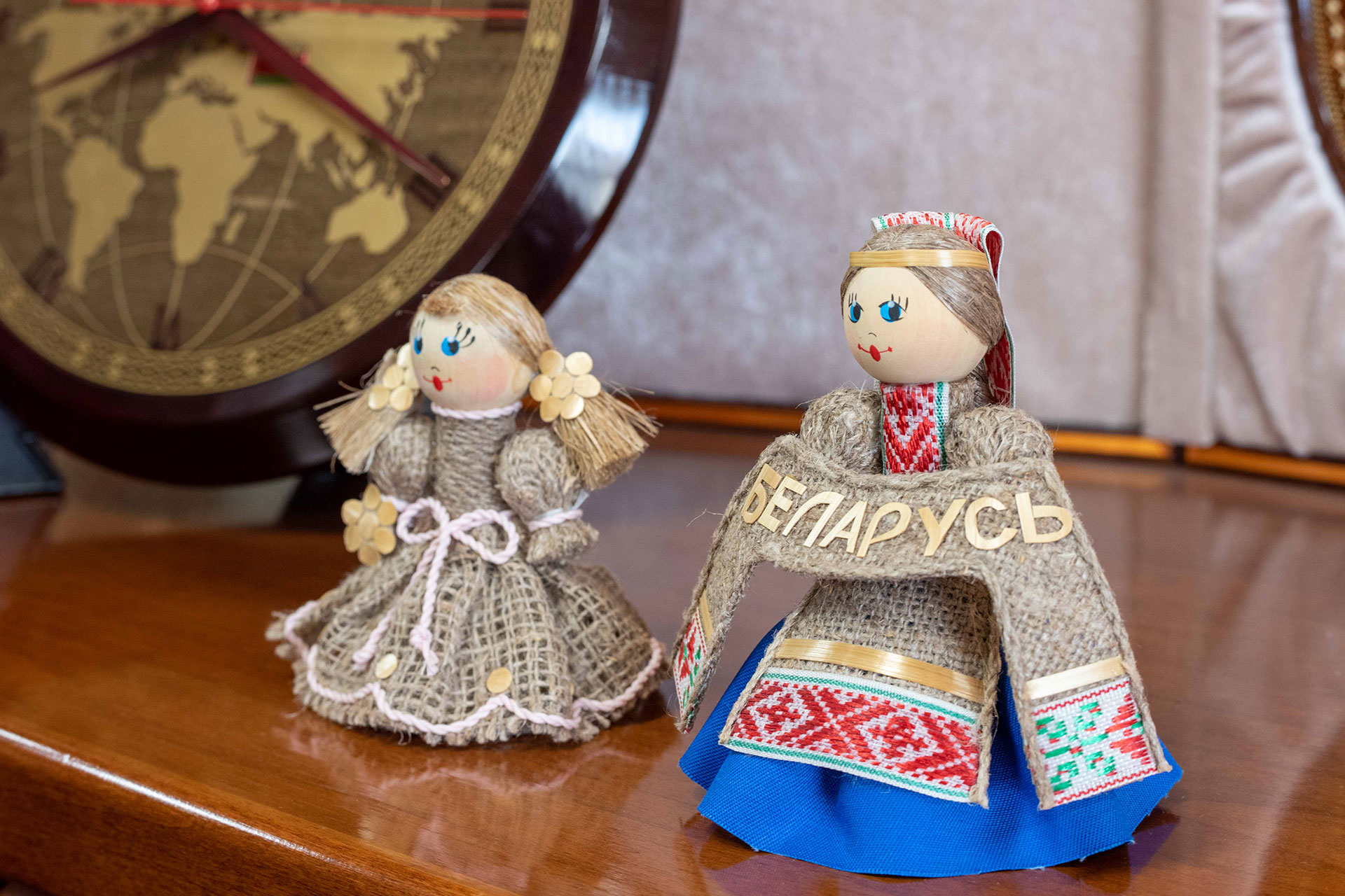 白石市役所の応接室には、ベラルーシの新体操チームから贈られた人形が飾られています。