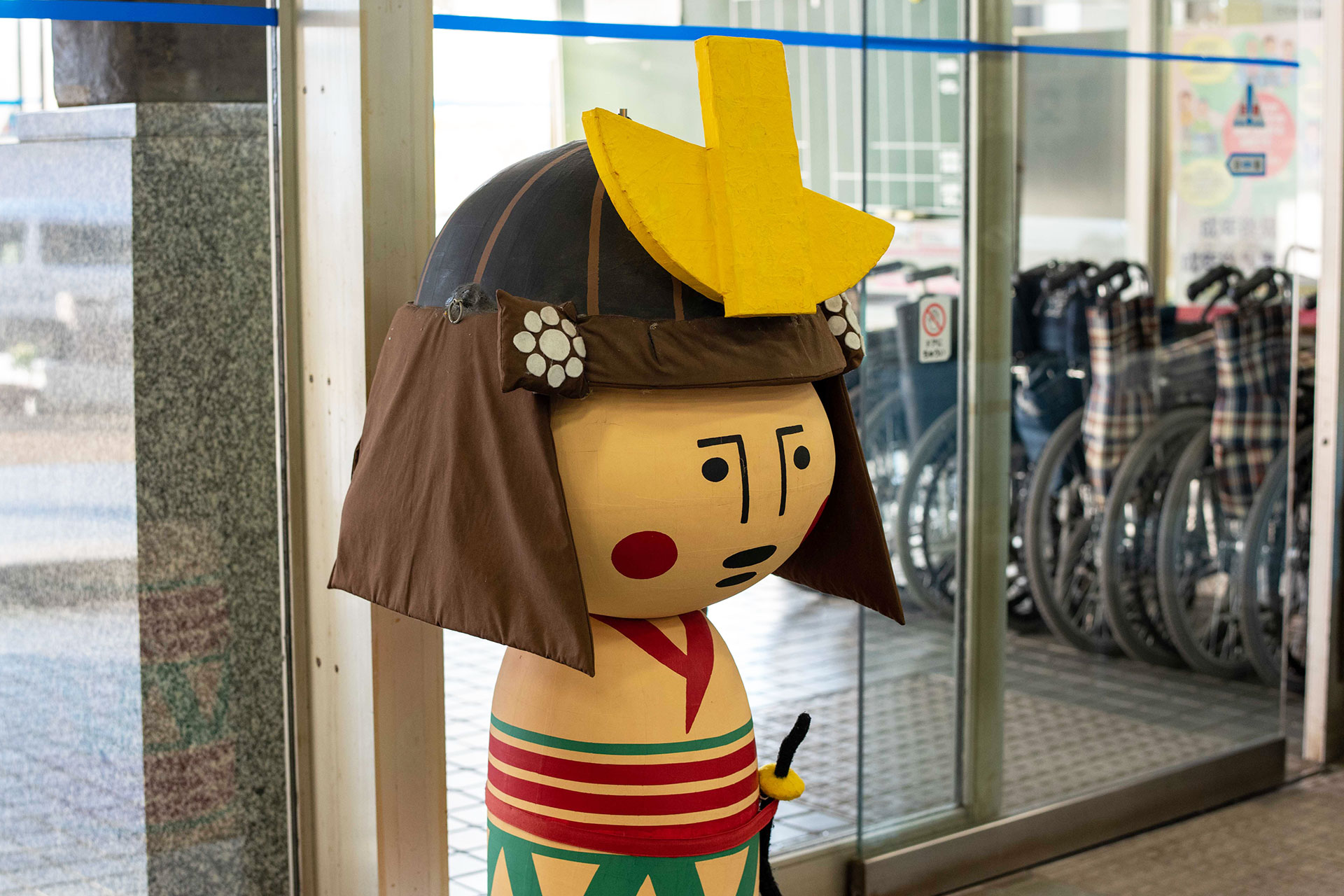 こけしの産地としても知られる白石市役所の玄関には、兜をかぶったこけしの人形が置かれています。