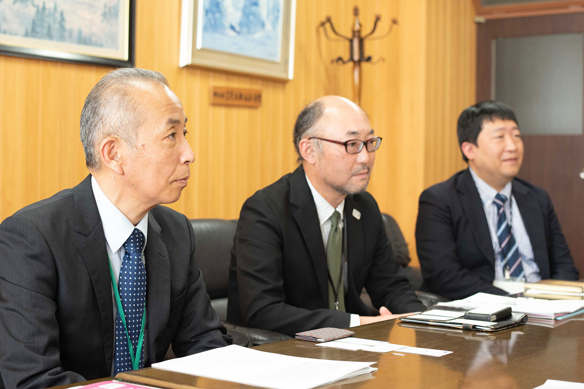 インタビューに応える、白石市の遠藤輝雄・企画情報課長(手前)、橋谷田孝治・東京オリンピック・パラリンピック推進室長(中央)、村上勝昭・技術主幹(奥)