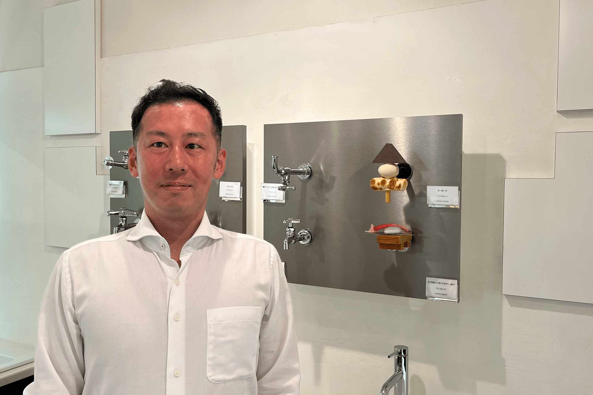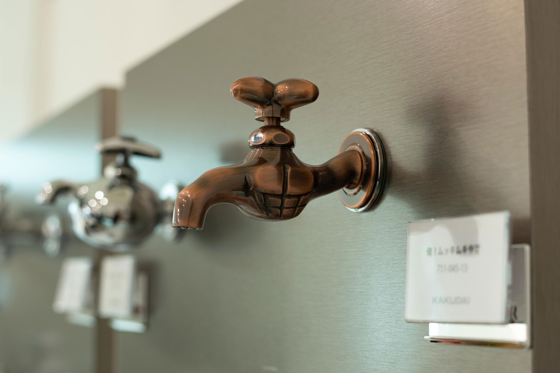 ブロンズの蛇口をよく見ると、鍛え抜かれた腹筋が割れていました。商品名は「俺!ムッキムキやで」。大阪市にある水道用品メーカー「カクダイ」の本社には、こうした個性あふれる水栓が並んでいます。